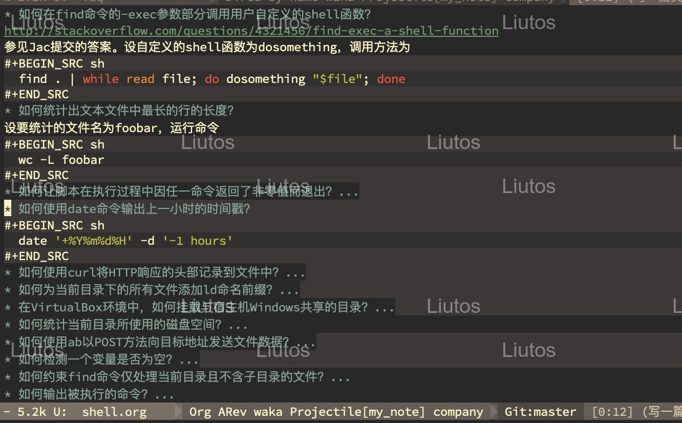 (第一次尝试给自己的图片打水印,有点好玩)每一个一级条目都是一个问题,并且这个文件中只有一级条目。而条目下的内容则是对标题的问题的回答。其中还有代码块——也就是写着BEGIN_SRC和END_SRC的那部分。用org-mode来记录笔记有几个好处,其中一个便是可以在笔记中插入任何Emacs支持的编程语言代码片段并具备语法高亮。当然了,还有一个巨大的优势,便是org-mode尽管看似花里胡哨,骨子里却是正统的纯文本文件,它可以很方便地在其它工具中处理。