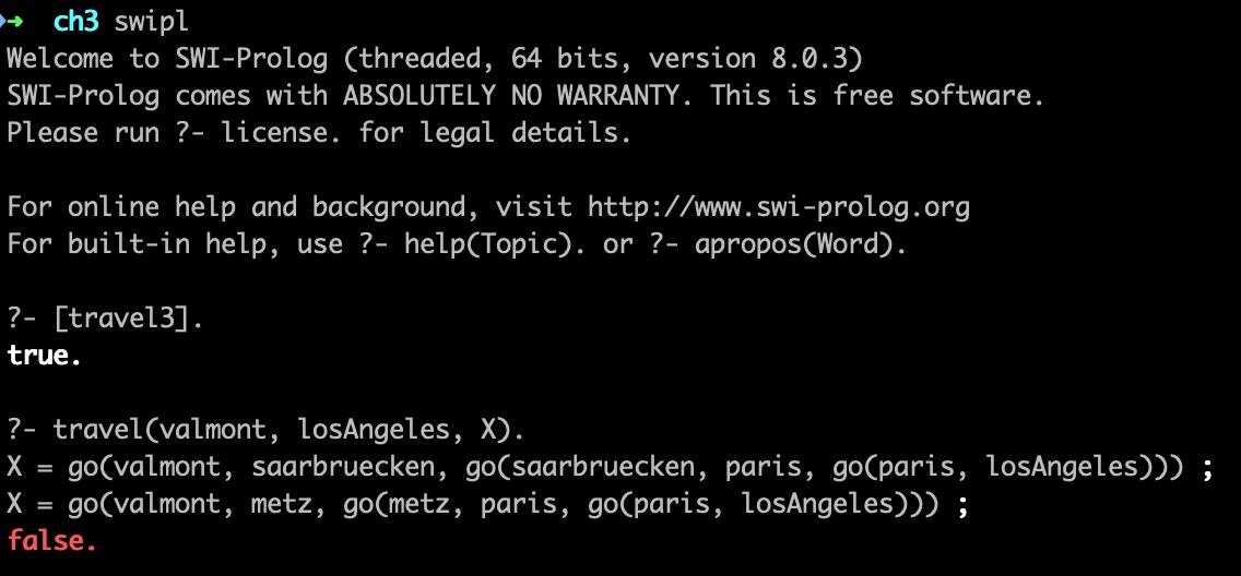 just_go(S, E) :- byPlane(S, E).加载这段代码后,就能让Prolog告诉我们,如何从valmont去往losAngeles了