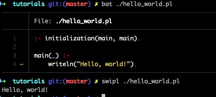 writeln("Hello, world!").然后运行命令swipl ./hello_world.pl即可输出Hello, world!到屏幕上,如下图所示