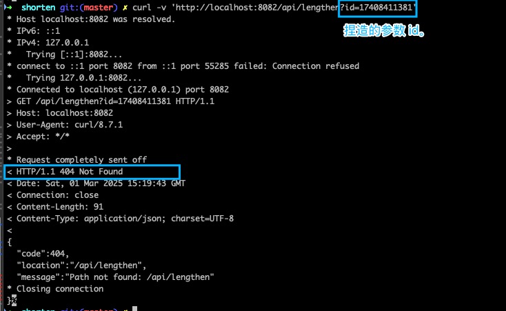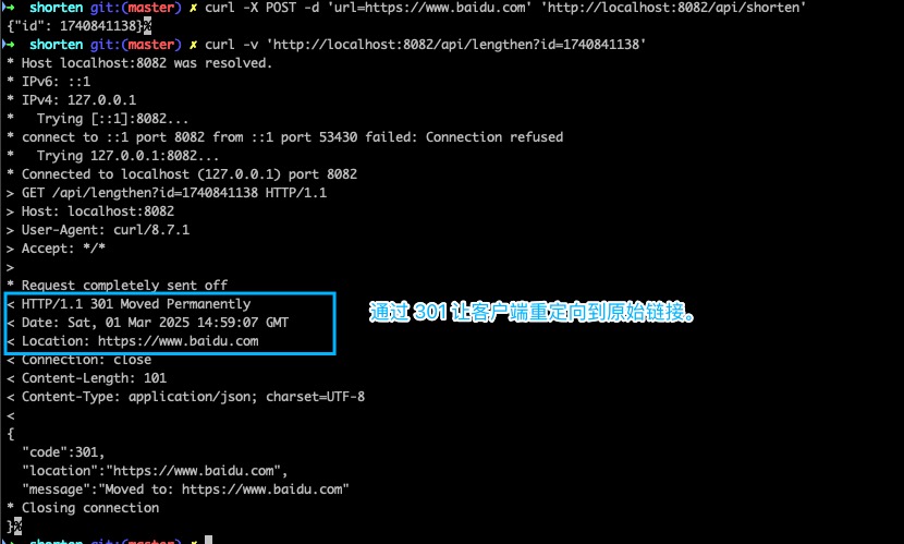 sleep(100000000).启动 HTTP 服务后,先请求接口/api/shorten,获得一个短链的 ID,再访问新接口即可重定向到原始 URL。