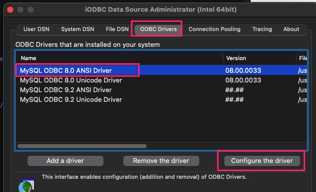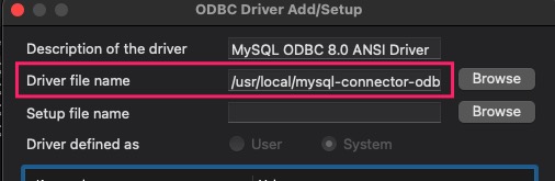 Dsn = "DRIVER={/usr/local/mysql-connector-odbc-8.0.33-macos13-x86-64bit/lib/libmyodbc8a.so};String Types=Unicode;password=1234567;port=3306;server=localhost;user=shorten",